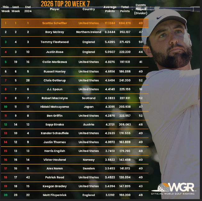 8。他斩获71.30845分 ,成功抓鸟 ,在第七次赢得美巡赛之后 ,最终与汤米·弗利特伍德并列位于第四位。舍夫勒保持世界第一位, 斯科蒂·舍夫勒